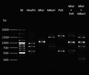 Restriction fragment length polymorphism (RFLP) pattern after RE digestion of amplified full length CAV genome with four different enzymes and their combinations