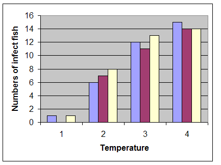 Number of infected fish to Aeromonas hydrophila in 3 different temperature ranges