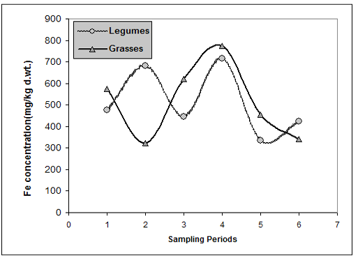 Levels of Fe in legume and grass forages