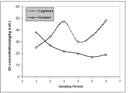 Levels of Zn in legume and grass forages