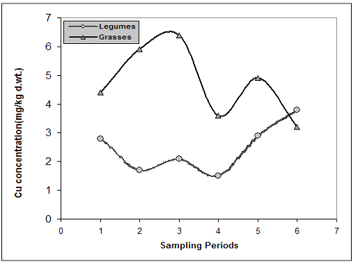 Levels of Cu in legume and grass forages