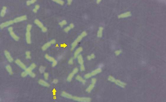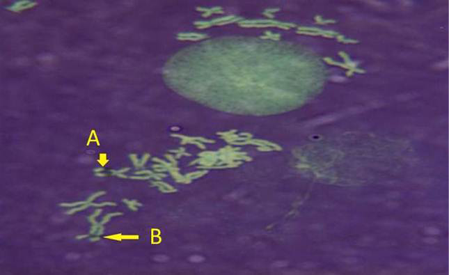 (A) Deletion chromatid; (B) Simple fragment infected ewe (acridine orange stain x100)