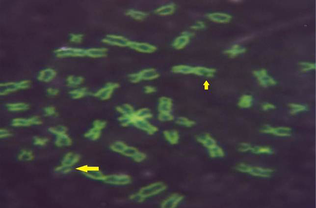 Sister Chromatid exchange in infected ewe (acridine orange stain x 100)