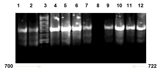 Candida kefyr lane 1, 2, 4, 5, 6, 7, 9, 10, 11 and 12: band size (722bp); Lane 3: ladder 1kb; Lane 8: negative control (TBE and loading buffer)