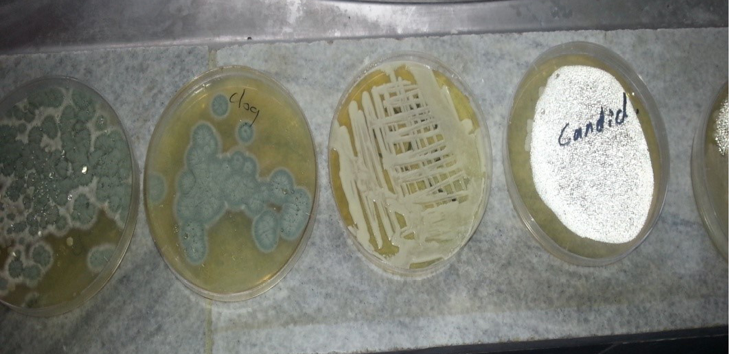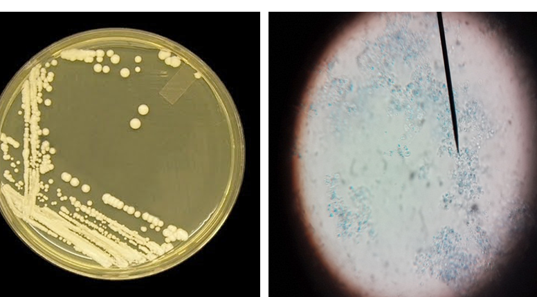 Candida colonies creamy muciod appear on SDA and Malt extract on left side and, unicellular cell of Candida stained by Lacto phenol cotton blue under X 400 on right side