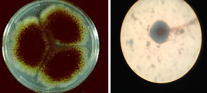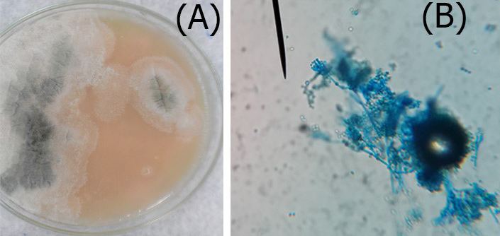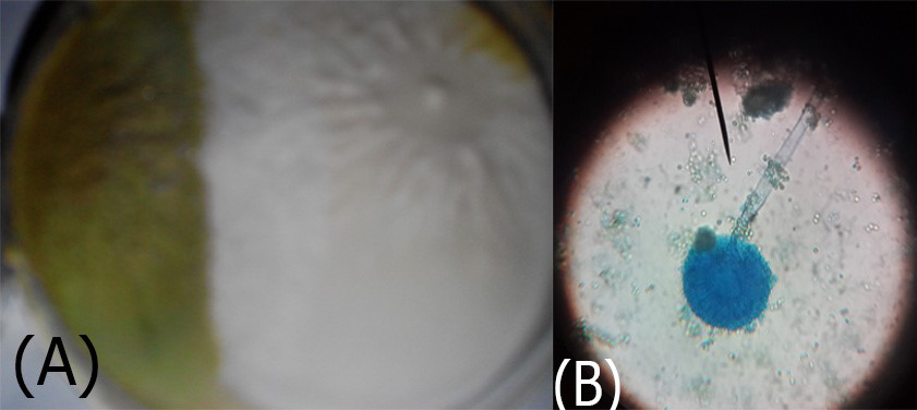 A. Aspergillus flavus colonies greenish-oily colour; B. reproductive head on Conidiophores very clear