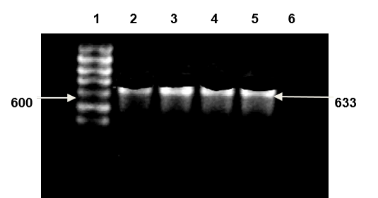 Lane 1: DNA ladder 1kb; Lane 2, 3, 4, 5: Candida famata band size (633bp); Lane 6 negative control (TBE and loading buffer)