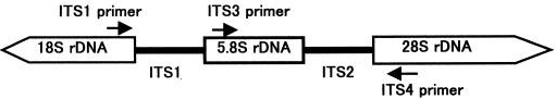 Schematic representation of the fungal ribosomal genes containing the primer target areas used in this study