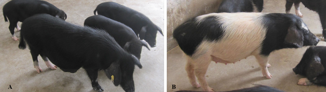 Typical appearances of Jue-ma minipigs: (A) the complete black minipigs; (B) the spotted minipig