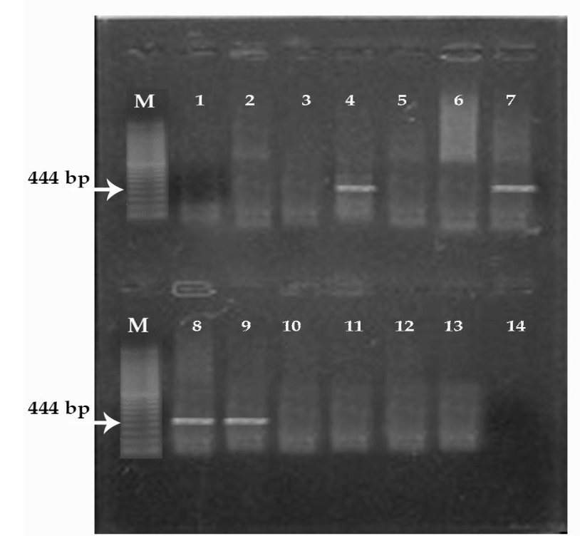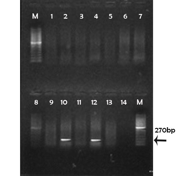 (M) marker 100pb; Lane 1, 2, 3, 4, 5, 6, 7, 8, 9, 11 and 13: negative; Lane 10, 12: positive; Lane 14: controle negative