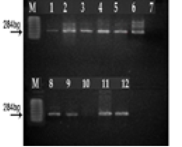 Agarose gel electrophoresis showing amplification of 284 pb fragment using las B primer