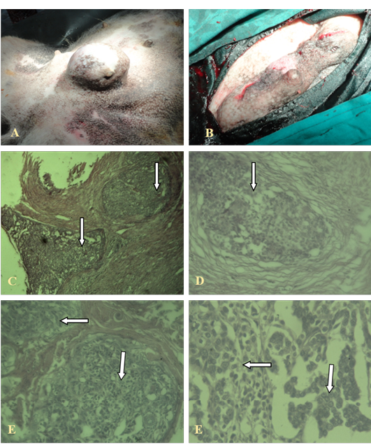 A, B: Gross cutaneous projection in post umbilical region with involvement of neighbouring glands; C, (4X), D (10X), E, F (40X): Showing pleomorphic cells with increased mitotic figures, without involvement of basal cells (in the arrows)