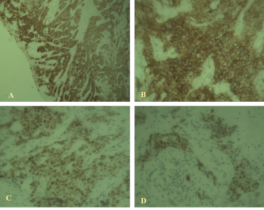 A: High-grade ductal carcinoma in situ associated with invasive mammary carcinoma positive for estrogen receptor (40x); B: High- grade ductal carcinoma in situ positive for HER2 (100x); C, D: Weak staining with Ki67 indicating luminal A type invasive ductal carcinoma (40X).