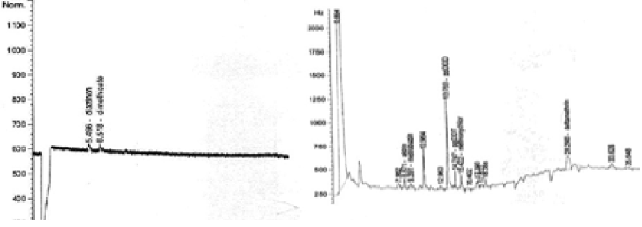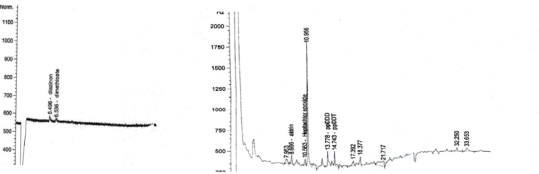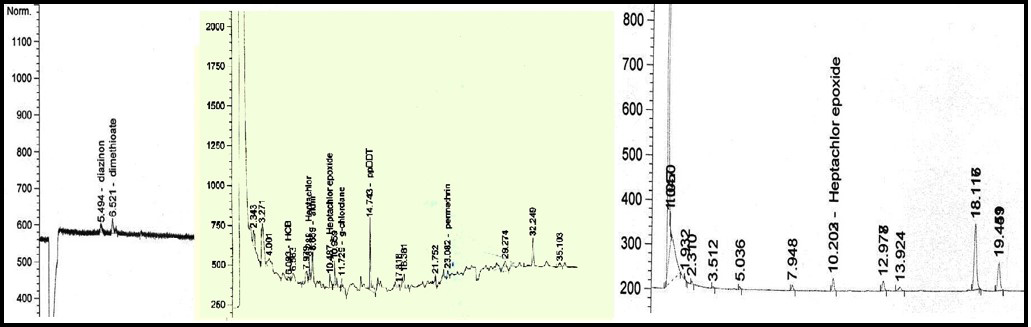 diazinon (5.494min; dimethioate (6.521min); HCB (6.093min); heptachlor (8.288min); aldrin (8.659min); heptachlor epoxide (10.487min); g-chlordane (11.729min); ppDDT (14.743min), permethrin (23.082min); heptachlor epoxide (10.203min); deltamethrin (28.551min)