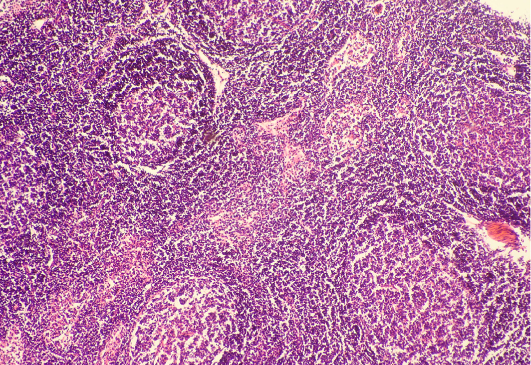 In cortex, number of follicles is increased and also showing increased number of lymphocytes; H&E x100