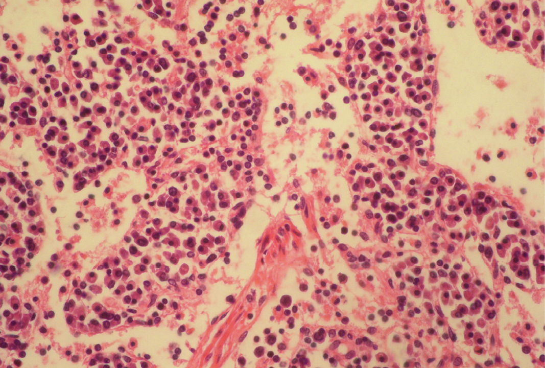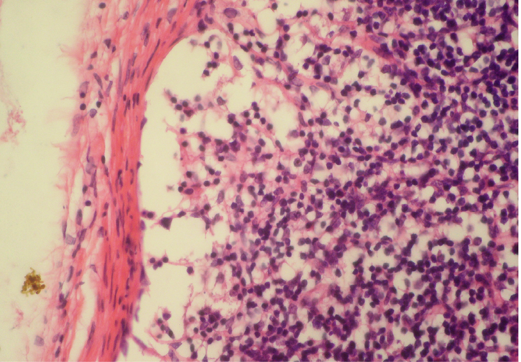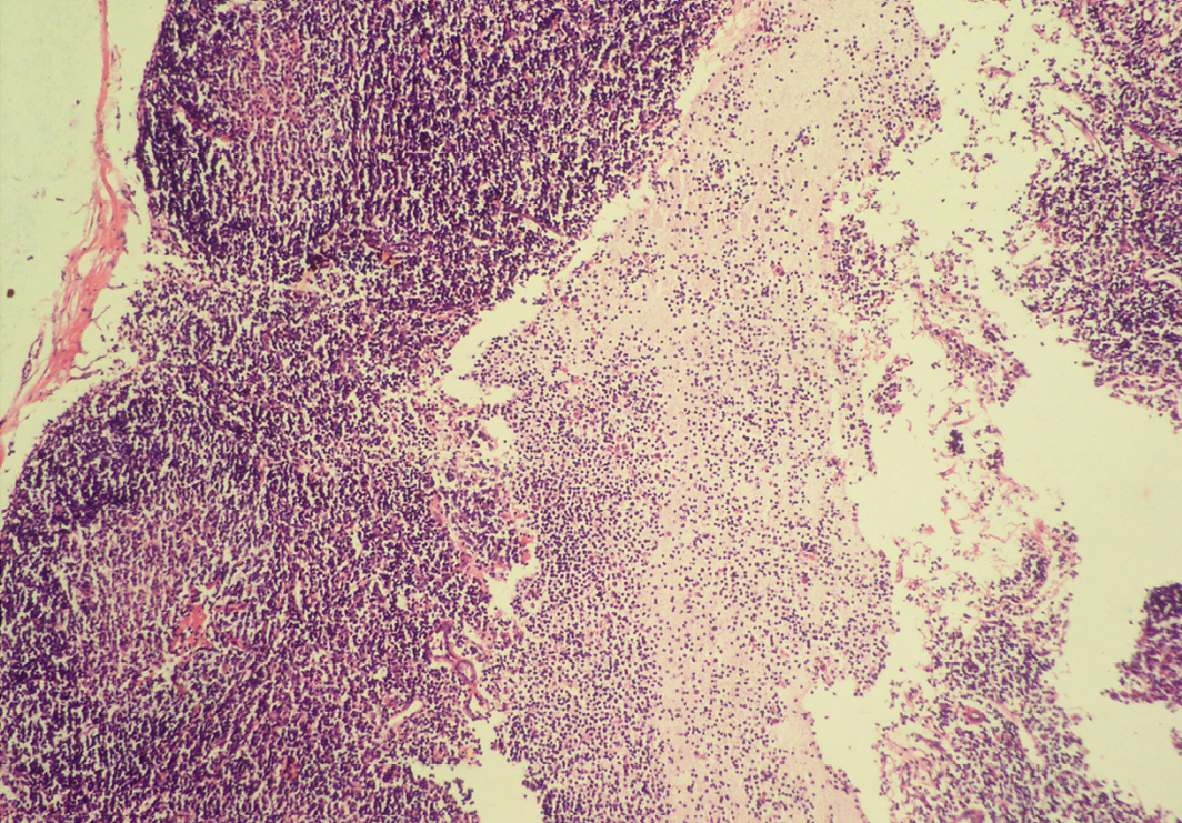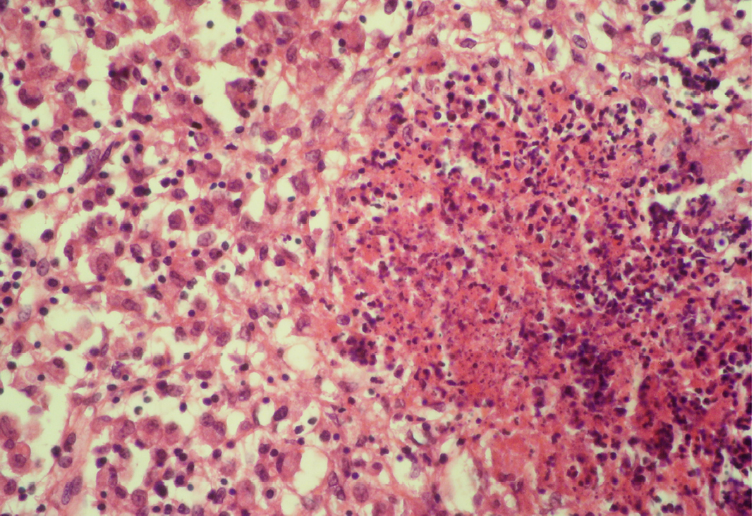 The area is surrounded by macrophages (histiocytes); H&E x400