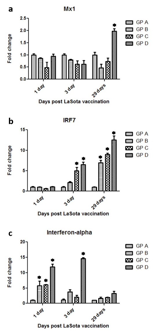 Gene expression of the interferon inducible genes Mx1 (a), INRF7 (b) and interferon-alpha (c) post NDV vaccination and treatment with OEO