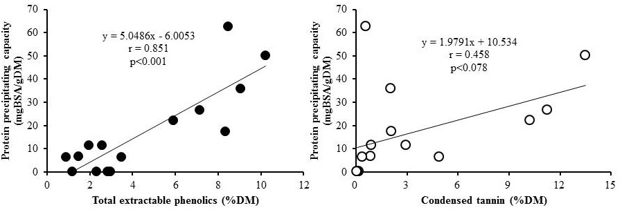 Correlation between protein precipitating capacity with the contents of total extractable phenolics (left) and condensed tannins (right)