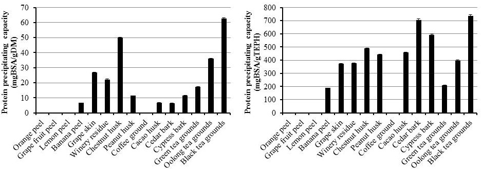 Protein precipitating capacity on a dry matter basis (left) and on a total extractable phenolics basis (right) in agro-industrial by-products