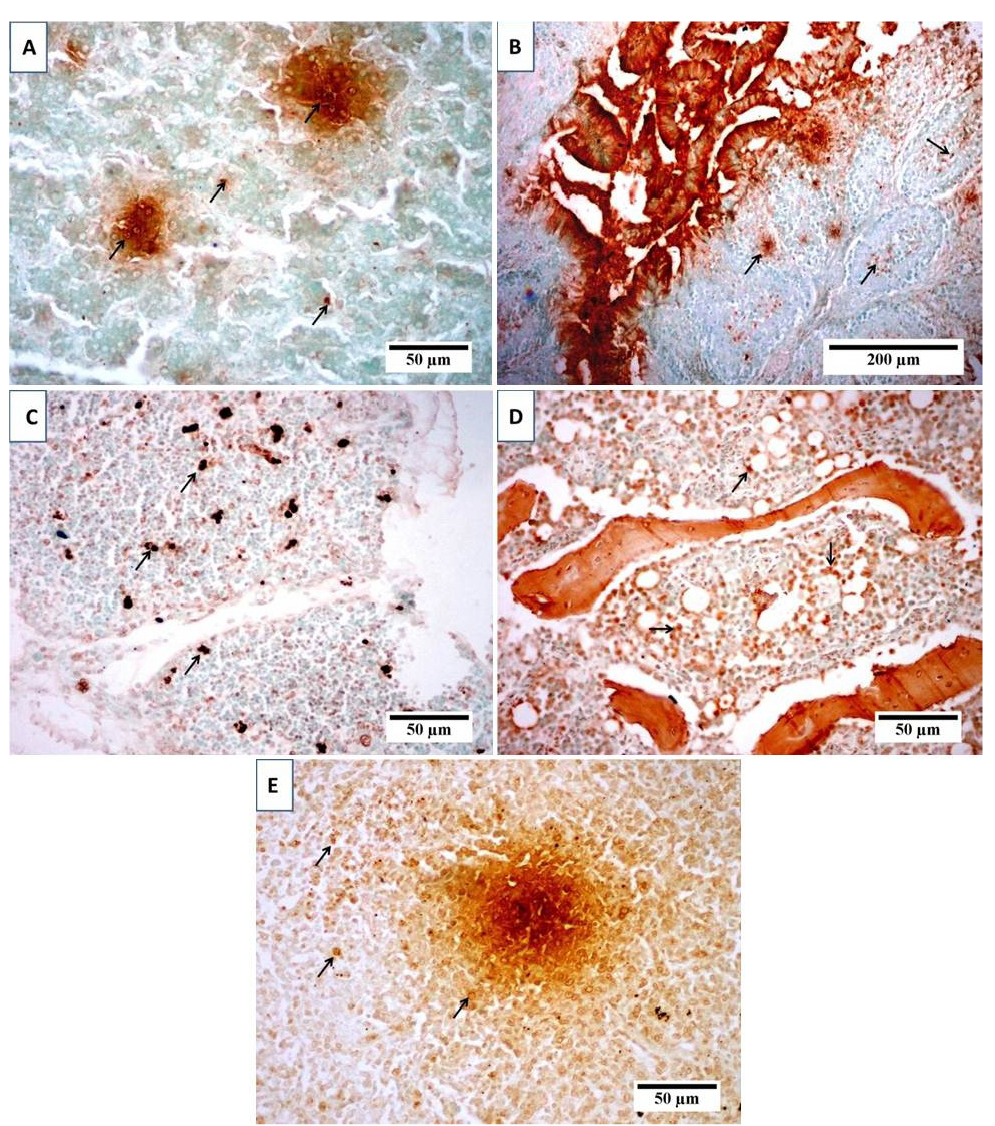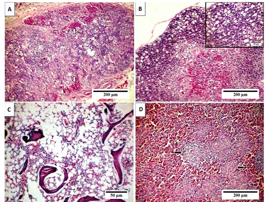 Effect of CIAV on thymus (A, B), bone marrow (C), and spleen (D), stained with HE