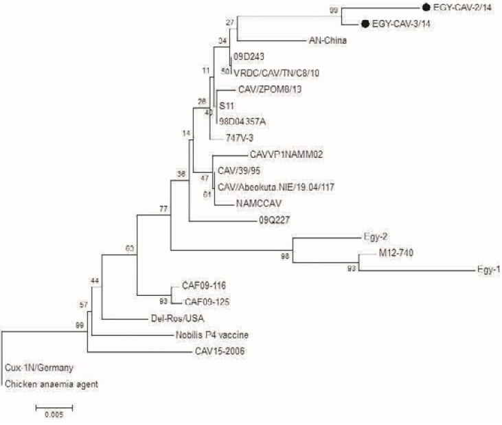 Phylogenetic tree for the 2 Egyptian CAV and other related CAV strains based on the partial VP1 gene sequence. The viruses used in this study were indicated by black dots