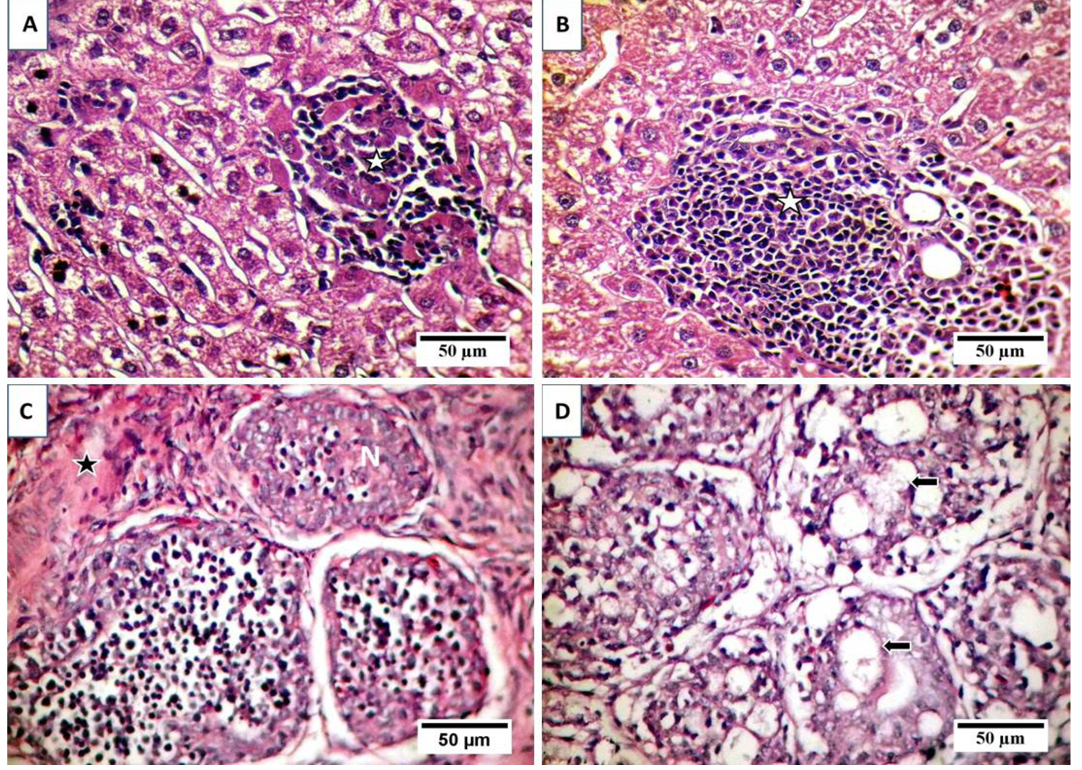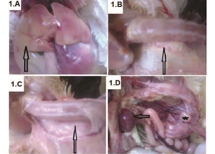 Broiler chickens infected with CAV showed pale liver (A-arrow); Atrophied thymus (B-arrow) sometimes resulting in an almost complete absence of thymic lobes (C-arrow), Enlarged spleen (D-arrow) and atrophied bursa of Fabricius (D-star)