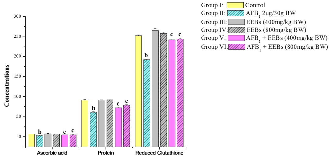 Effect of EEBs on ascorbic acid (ascorbic acid/100g tissue wet weight), protein (mg g-1 fresh wt) and reduced glutathione (nmols GSH g-1 tissue) in AFB1 intoxicated rats