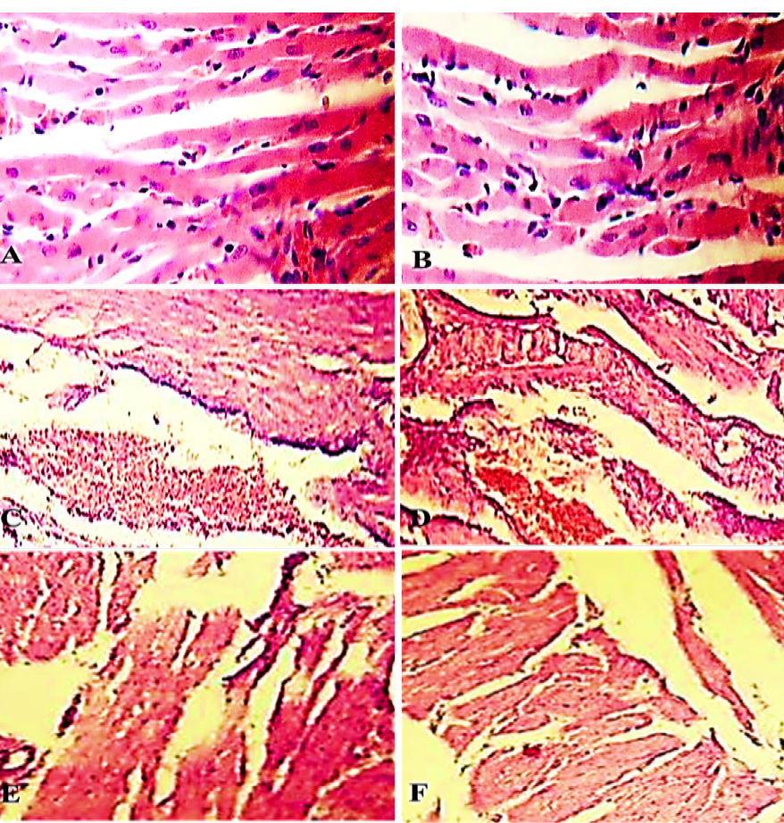 Heart of control group (C0h and C1h) showed normal muscle fiber run in different directions with acidophilic sarcoplasm and oval nuclei (A and B). Heart from electrocuted group (E0h) showed necrosis and intramyocardial hemorrhage (C and D). Heart of the electrocuted group (E1h) showed necrosis, fragmentation and contraction bands (E and F)