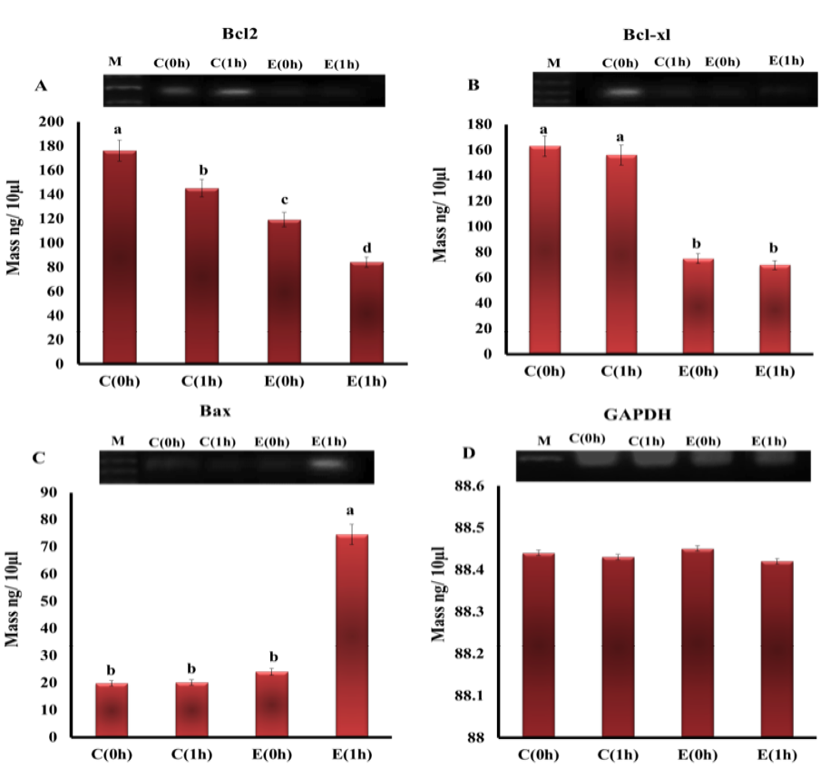The expression level of mRNAs of A) Bcl-2; B) Bcl-xl; C) Bax; D) GAPDH genes in the heart tissue of rats from different groups. (M - DNA marker (100 pb))