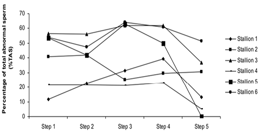 Variation of the percentage of total abnormal sperm (%TAS) according to stallions during steps of the freezing-thawing semen protocol