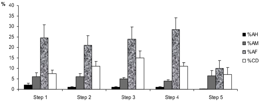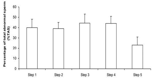 Percentage of total abnormal sperm (%TAS) during steps of the freezing-thawing semen protocol (means ± sem); a,b: p<0.05