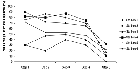 Variation of the percentage of motile sperm (%MS) according to stallions during steps of the freezing-thawing semen protocol