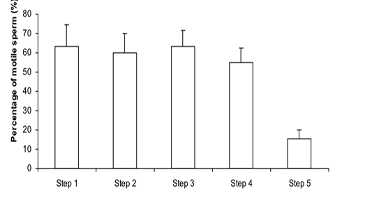 Percentage of motile sperm (%MS) during steps of the freezing-thawing semen protocol (means ± sem); a,b: p<0.05