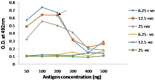 Reactivity of serially diluted positive serum with recombinant PPRV N Protein; Head of arrow indicates 75% absorbance (A492) of the plateau, which corresponds to optimal working dilution of the PPRV N protein and PPRV antibodies