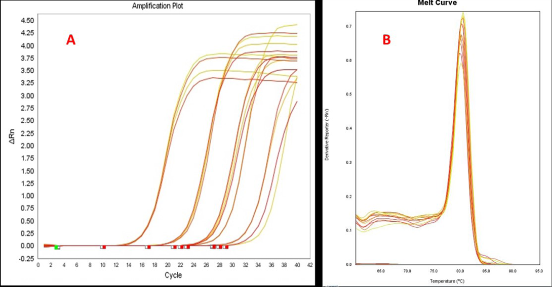 Amplification plots (A) and melting curves (B) for MMP9 gene real-time PCR analysis in CMT tissues