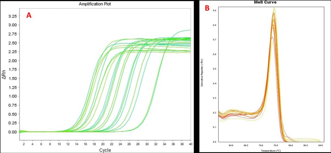 Amplification plots (A) and melting curves (B) for MMP2 gene real-time PCR analysis in CMT tissues