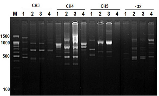 RAPD PCR patterns generated by primer CH3, CH4, CH5 and primer -32. The fragment patterns are identified as; Lanes 1: Geese; Lanes 2: Muscovy; Lanes 3: Sudani; Lanes 4: White Pekin; Lane M: DNA marker (100 bp DNA ladder was loaded)
