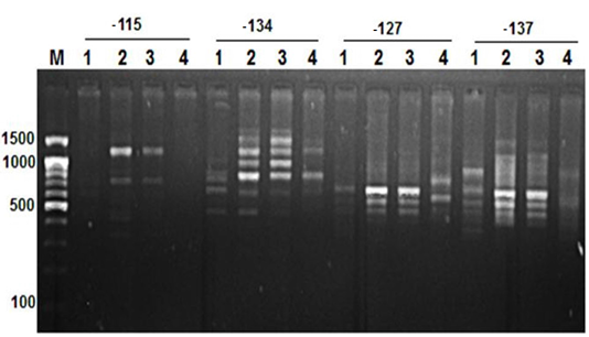 RAPD PCR patterns generated by primer -115, -134, -127 and -137. The fragment patterns are identified as; Lanes 1: Geese; Lanes 2: Muscovy; Lanes 3: Sudani; Lanes 4: White Pekin; Lane M: DNA marker (100 bp DNA ladder was loaded)