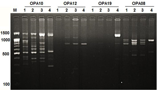 RAPD PCR patterns generated by primer OPA10, OPA12, OPA19 and OPA08. The fragment patterns are identified as; Lanes 1: Geese; Lanes 2: Muscovy; Lanes 3: Sudani; Lanes 4: White Pekin; Lane M: DNA marker (100 bp DNA ladder was loaded)