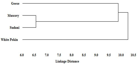 Dendogram of the phylogenetic relationships among Geese and Muscovy, Sudani and White Pekin duck breeds based on genetic distance