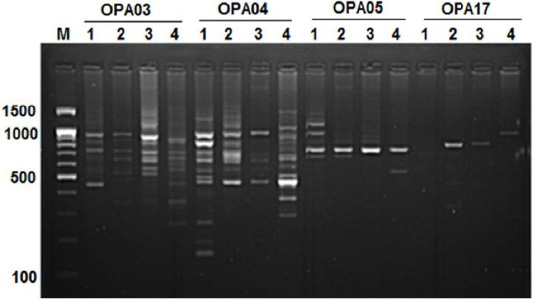 RAPD PCR patterns generated by primer OPA03, OPA04, OPA05 and OPA17. The fragment patterns are identified as; Lanes 1: Geese; Lanes 2: Muscovy; Lanes 3: Sudani; Lanes 4: White Pekin; Lane M: DNA marker (100 bp DNA ladder was loaded)