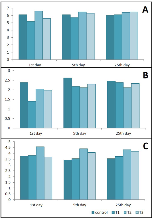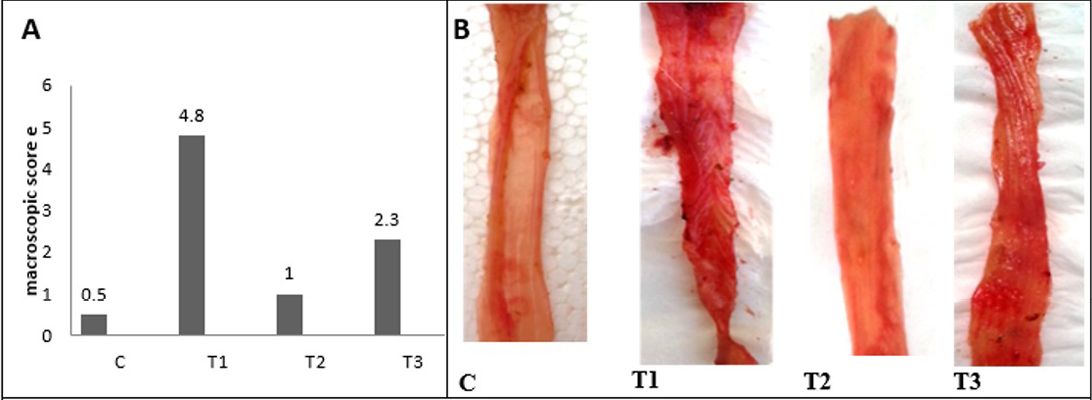 A) Macroscopic scoring of colitis; B) Gross lesion of colon wall after 25 days of colitis; C) control group; T1) Acetic acid colitis group showing thickness and rough of mucosa with large blood patches in different areas of colon; T2) Lactobacillus acidophilus administered; T3) Lactobacillus acidophilus administered and colitis showing small bleeding spots along the colon and thickening in mucosa and the mucosa is clear