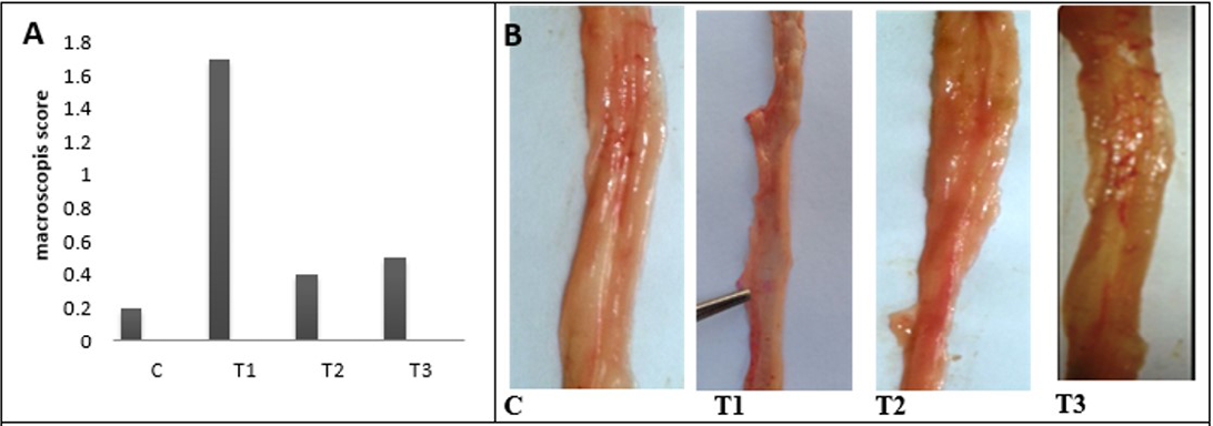 A) Macroscopic scoring of colitis; B) Gross lesion of colon wall after 5 days of colitis; C) control group; T1) Acetic acid colitis group, showing sever blood congestion along the colon with thickness and rough of mucosa; T2) Lactobacillus acidophilus administered; T3) Lactobacillus acidophilus administered and colitis showing small bleeding spots along the colon and thickening in mucosa and the mucosa is clear