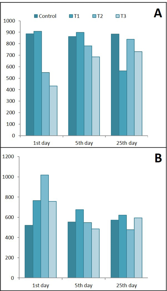 Ameliorative effects of Lactobacillus acidophilus on A) Serum leptin; B) Serum IL-6 in rats with acetic acid, mean±SE, n = 6. C) Control; T1) have acetic acid colitis; T2) received (5 ×108 CFU) of Lactobacillus acidophilus; T3) have acetic acid colitis and received (5×108 CFU) of Lactobacillus acidophilus