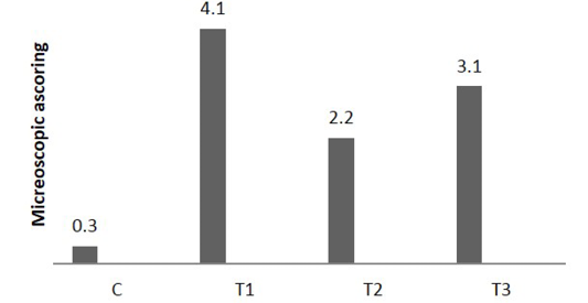 Microscopic score of colitis after 25 days in colon sections, (n = 24). C) Control; T1) acetic acid colitis; T2) (5 ×108 CFU) of Lactobacillus acidophilus; T3) acetic acid