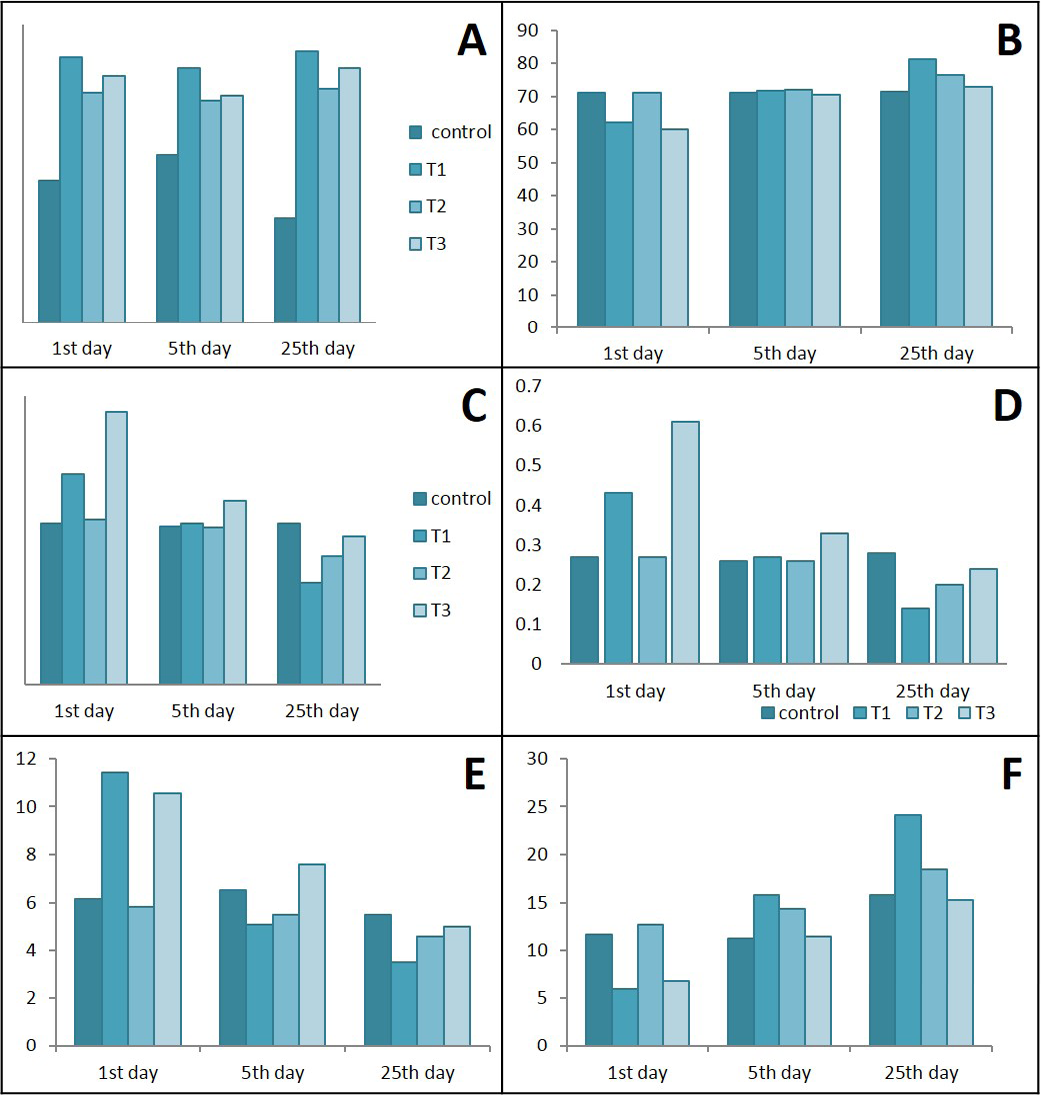 Ameliorative effects of Lactobacillus acidophilus on A) total WBCs; B) Lymphocytes; C) Neutrophil; D) Neutrophils / lymphocytes ratio; E) Monocytes; F) Lymphocytes / monocytes ratio in rats with acetic acid, mean±SE, n = 6.
