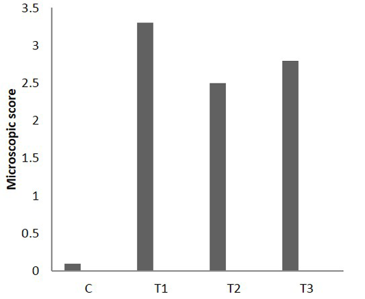 Microscopic score of colitis after 5 days in colon sections, (n = 24). C) control AA colitis; T1); T2) received (5 ×108 CFU) of Lactobacillus acidophilus; T3) received (5×108 CFU) of Lactobacillus acidophilus + AA colitis