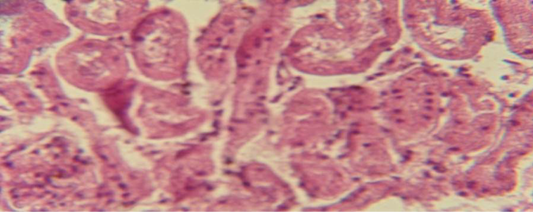 Histological section of kidney of treatment group with ethambutol + extract revealed cellular degeneration of epithelial cell lining renal tubule