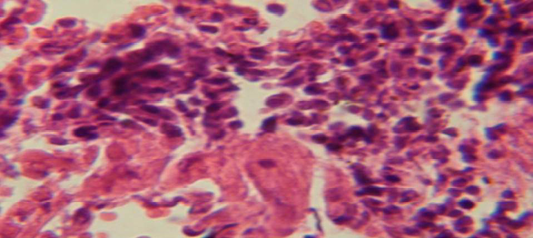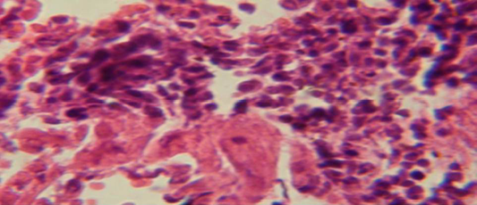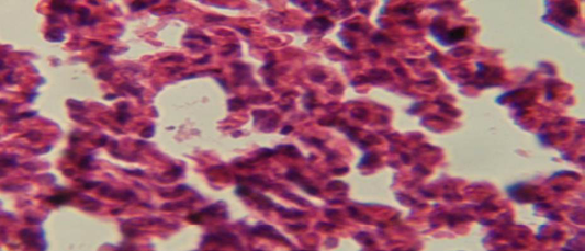 Histological section in lung of infected group showing large granulamatous lesion consist of aggregation of macrophages in lung parenchyma