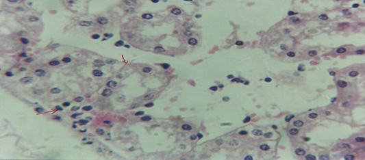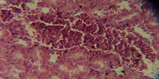 Histological section in kidney of infected group showing congestion of blood vessel with infiltration of inflammatory cell in their lumen